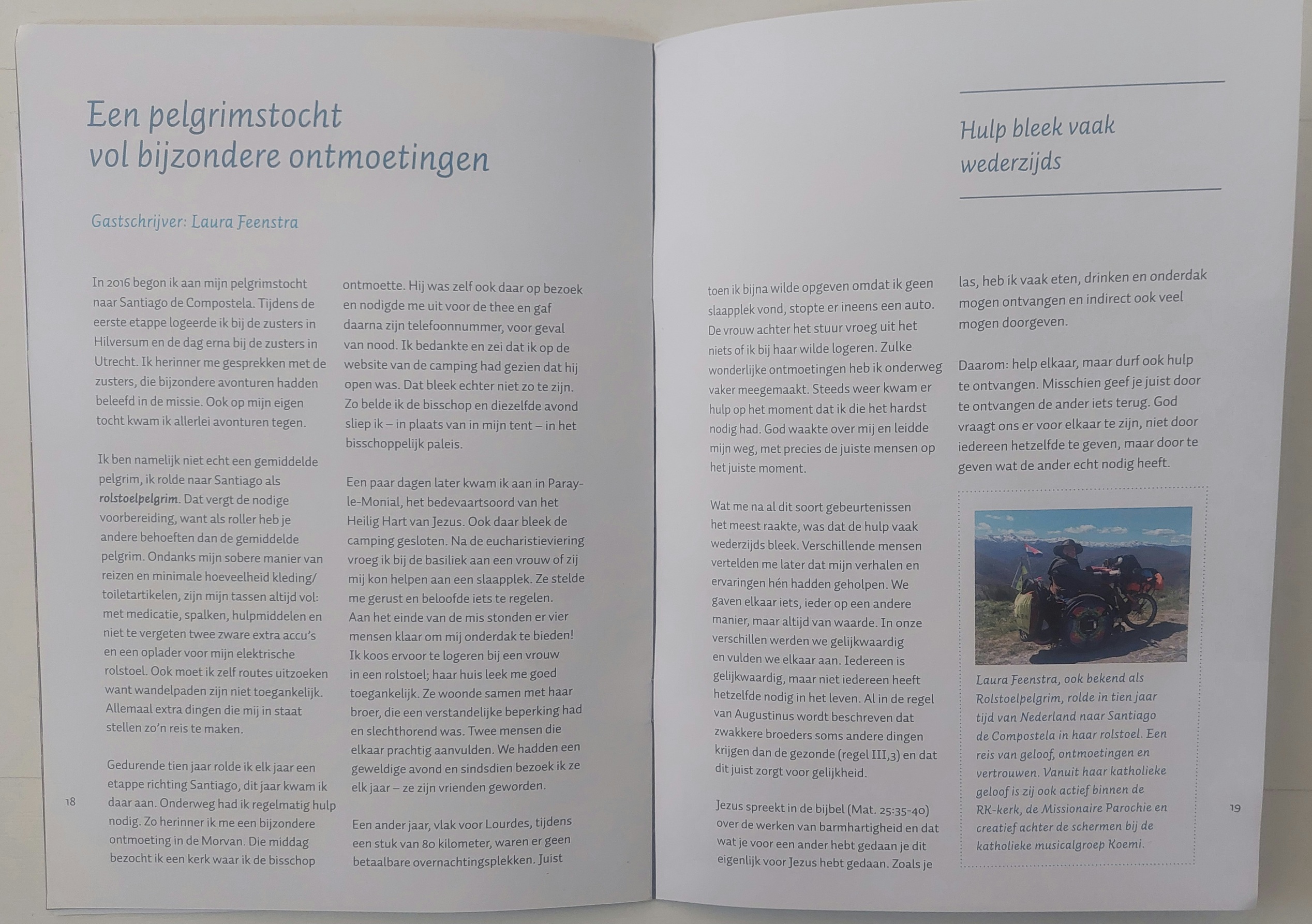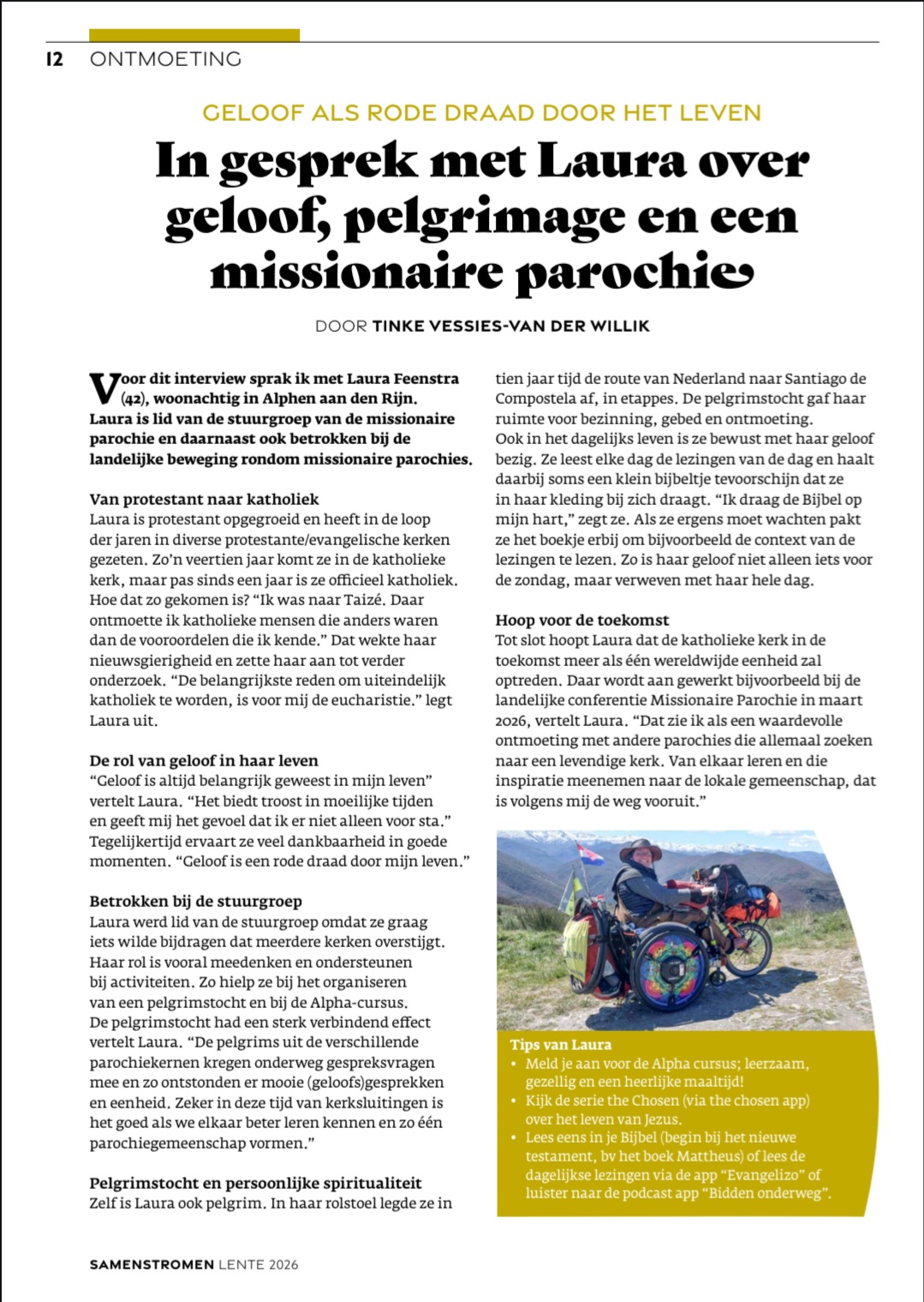 Laura Feenstra, ook bekend als Rolstoelpelgrim, rolde in tien jaar tijd van Nederland naar Santiago de Compostela in haar rolstoel. Een reis van geloof, ontmoetingen en vertrouwen. Vanuit haar katholieke geloof is zij ook actief binnen de RK-kerk, de Missionaire Parochie en creatief achter de schermen bij de katholieke musicalgroep Koemi