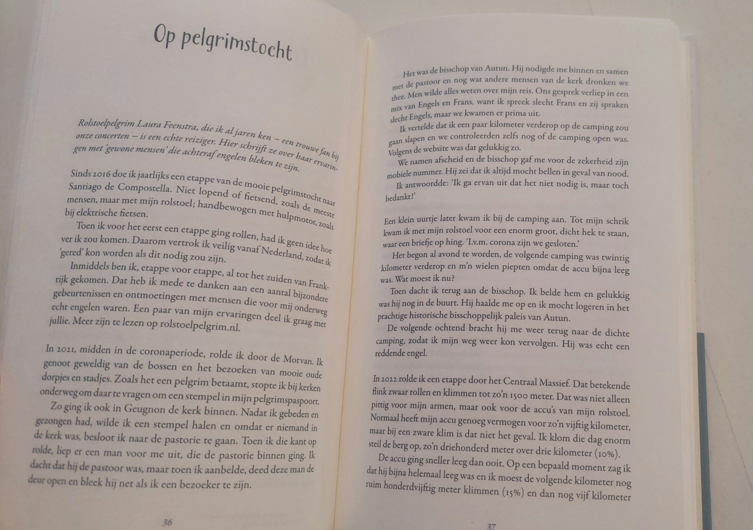 Bezinnen, bidden en onthaasten. Daar draait het voor Laura om en dus neemt ze ook alle tijd om bijeen nieuw startpunt op de route te komen. “Ik heb een aangepaste auto waar mijn rolstoel in kan en daarmee rijd ik maximaal tweehonderd kilometer per dag. Deze zomer vervolg ik mijn route trouwens vanuit het Franse Rocamadour, in het Centraal Massief. Sommige mensen doen dat in tien uur, maar ik doe er met gemak een hele week over. Prima toch? Tijd heb ik genoeg, gezondheid iets minder, en daar pas ik me op aan. Dat is het voordeel van volledig afgekeurd zijn. Vakantiedagen heb ik in overvloed, al moet ik het wel netjes melden bij het UWV als ik langer dan een maand op stap ben.’
