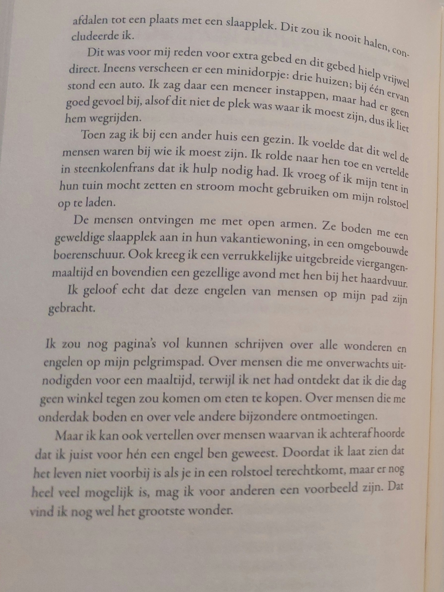 Een ander jaar, vlak voor Lourdes, tijdens een stuk van 80 kilometer, waren er, geen betaalbare overnachtingsplekken. Juist toen ik bijna wilde opgeven omdat ik geen slaapplek vond, stopte er ineens een auto. De vrouw achter het stuur vroeg uit het niets of ik bij haar wilde logeren. Zulke wonderlijke ontmoetingen heb ik onderweg vaker meegemaakt. Steeds weer kwam er hulp op het moment dat ik die het hardst nodig had. God waakte over mij en leidde mijn weg, met precies de juiste mensen op het juiste moment. Wat me na al dit soort gebeurtenissen het meest raakte, was dat de hulp vaak wederzijds bleek. Verschillende mensen vertelden me later dat mijn verhalen en ervaringen hén hadden geholpen. We gaven elkaar iets, ieder op een andere manier, maar altijd van waarde. In onze verschillen werden we gelijkwaardig en vulden we elkaar aan. Iedereen is gelijkwaardig, maar niet iedereen heeft hetzelfde nodig in het leven. Al in de regel van Augustinus wordt beschreven dat zwakkere broeders soms andere dingen kregen dan de gezonde (regel 111,3) en dat dit juist zorgt voor gelijkheid. Jezus spreekt in de bijbel (Mat. 25:35-40) over de werken van barmhartigheid en dat wat je voor een ander hebt gedaan je dit eigenlijk voor Jezus hebt gedaan.